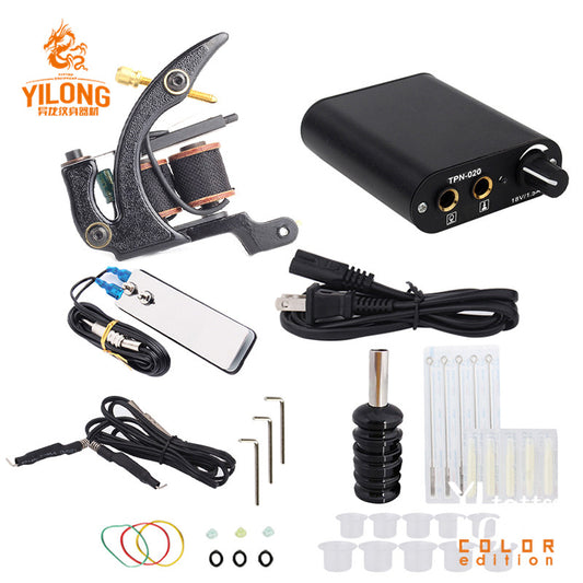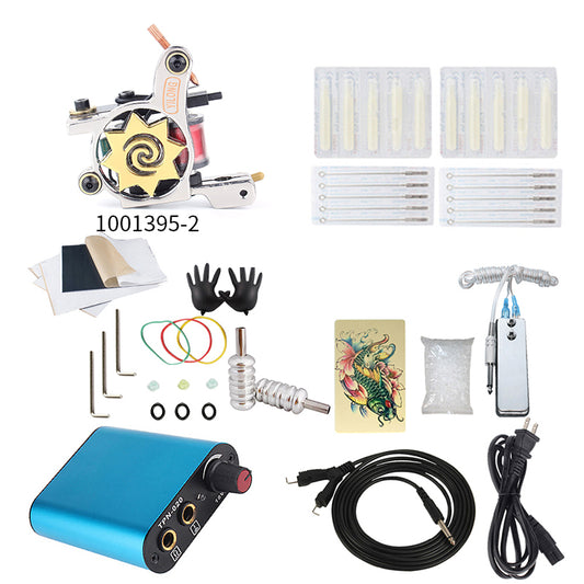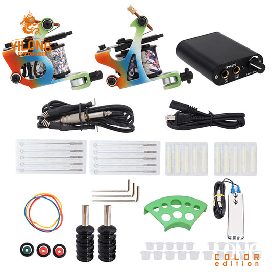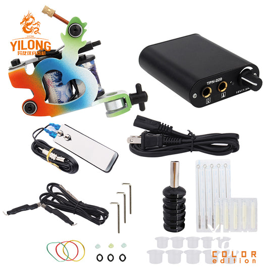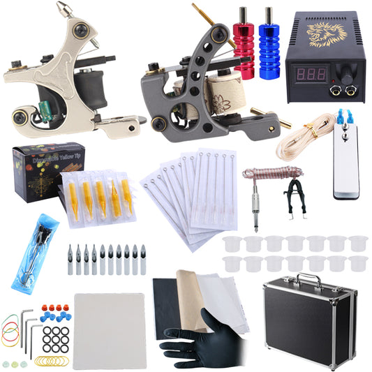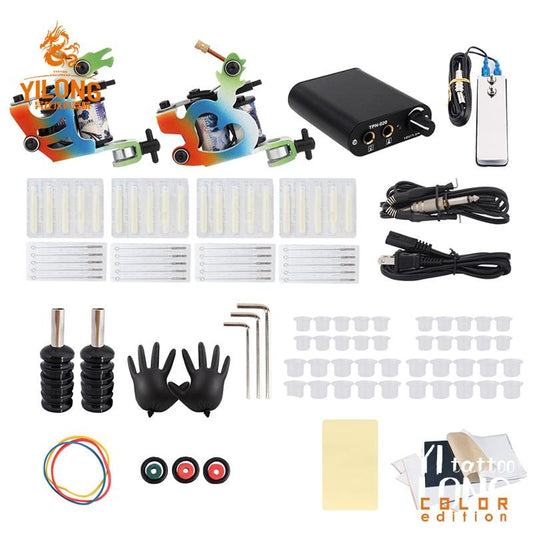 This complete tattoo kit includes coil tattoo machine, cord, tattoo power supply, tattoo foot pedal, tattoo inks, tattoo needles, and other tattoo accessories. When you have a tattoo kit, you can begin to tattoo.