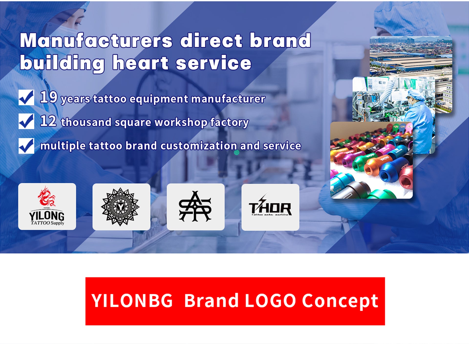 Founded in 2003, as one of China's tattoo equipment manufacturers, Yilong has been providing products and services to tattoo artists and tattoo lovers around the world for nearly 15years. We have our factories and brands. The products we are proud of include tattoo machine, tattoo needle, stainless steel spare parts, aluminum spare parts, disposable plastic, silicone spare parts, color materials, tattoo power supply, tattoo furniture, tattoo books, piercing jewelry tools and so on. At the same time, we also import foreign high-end tattoo machines, paints and other equipment.